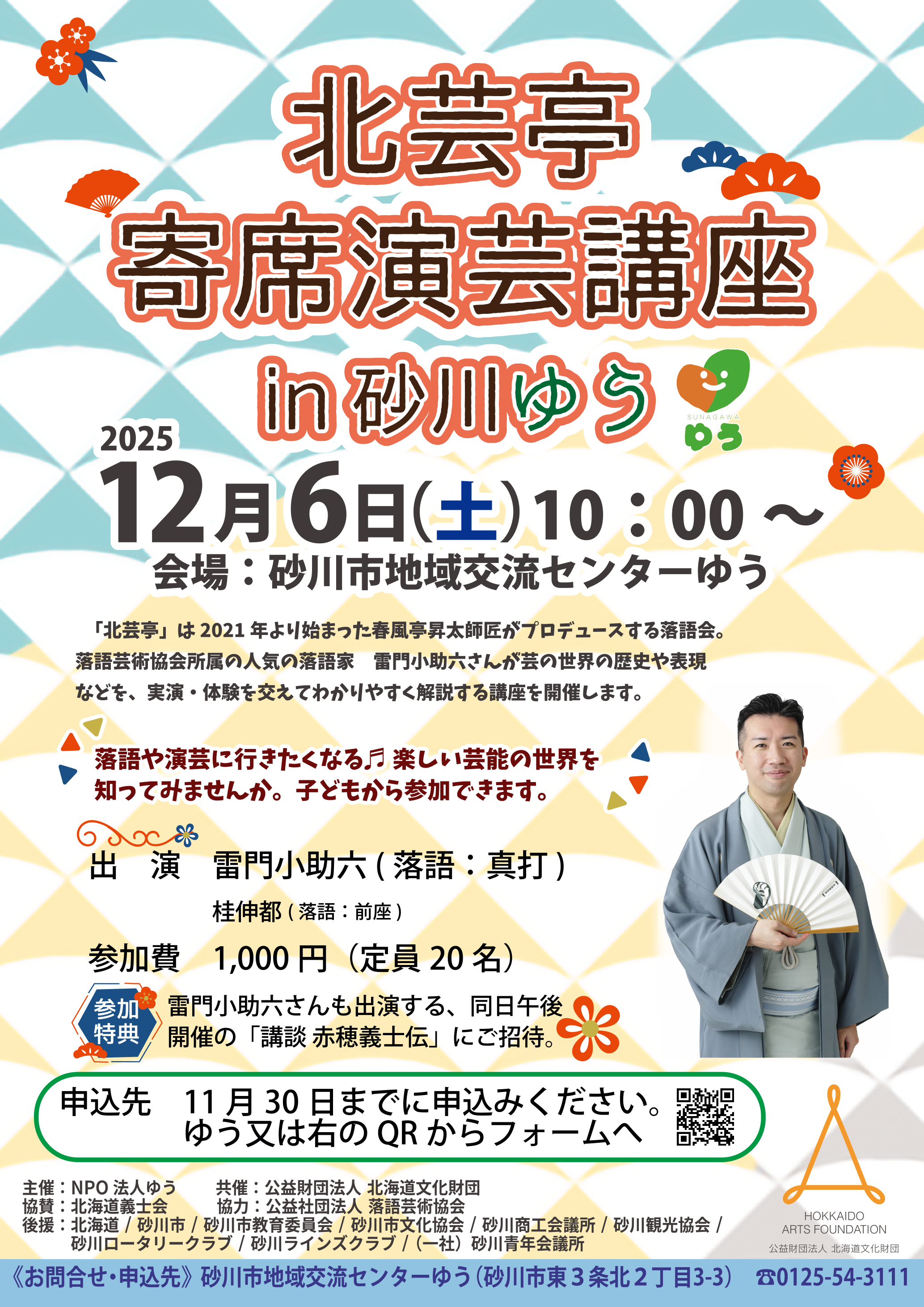 12月062025 「北芸亭・寄席演芸講座 in 砂川ゆう」 「北芸亭」は2021年より始まった春風亭昇太師匠がプロデュースする落語会。落語芸術協会所属の人気の落語家 雷門小助六さんが芸の世界の歴史や表現などを、実演・体験を交えてわかりやすく解説する講座を開催します。落語や演芸に行きたくなる♬ 楽しい芸能の世界を知ってみませんか。子どもから参加できます。 公演名北芸亭・寄席演芸講座 in 砂川ゆう 日 時2025年12月6日(土) 10:00~11:30 会 場砂川市地域交流センターゆう (砂川市東3条北2丁目3-3 JR砂川駅直結) 出 演雷門小助六(落語:真打) 桂伸都(落語:前座) 参加費1,000円 ※参加特典:同日午後開催の「講談 赤穂義士伝」にご招待。雷門小助六さんも出演します。 定 員20名(定員になり次第締め切りとします) お申込み下記「演芸講座申込」ボタンから必要事項を入力してお申し込みください ※定員に達し次第受付終了します 共 催公益財団法人 北海道文化財団 協 賛北海道義士会 協 力(公社)落語芸術協会 主 催NPO法人ゆう お問合せNPO法人ゆう ☎0125-54-3111 演芸講座申込