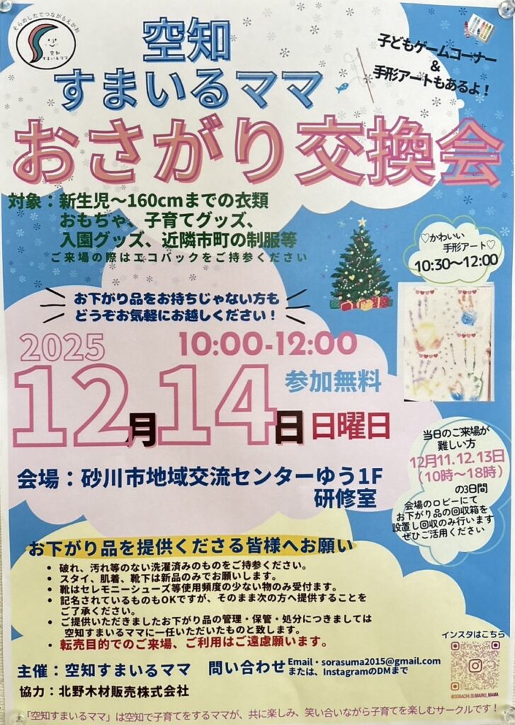 12月142025 おさがり交換会 12月11日・12日・13日(10時~18時)の3日間、ロビーにてお下がり品の回収箱を設置し、回収のみを行います。当日の参加が難しい方はぜひご活用ください。 イベント名おさがり交換会 日 時2025年12月14日(日)10:00~12:00 10:30~12:00(手形アート) 会 場砂川市地域交流センターゆう 大中小研修室 (砂川市東3条北2丁目3-3 JR砂川駅直結) 参加料無料 協 力北野木材販売株式会社 主 催空知すまいるママ お問合せ✉ sorasuma2015@gmail.com もしくは、 Instagram( https://www.instagram.com/sorachi.sumairu_mama?utm_source=ig_web_button_share_sheet&igsh=ZDNlZDc0MzIxNw== )DMまで