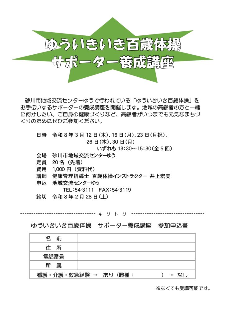 3月122026 【受講者募集】ゆういきいき百歳体操 サポーター養成講座 百歳体操の参加者を支援するサポーターを募集しています。講座を受講し、ほかのサポーターと一緒に高齢者を元気にするお手伝いをしてみませんか。 イベント名ゆういきいき百歳体操 サポーター養成講座 日 時2026年3月12日(木)、16日(月)、23日(月祝)、26日(木)、30日(月) いずれも13:30~15:30(全5回) お申込み2026年2月28日(土)までに、砂川市地域交流センターゆう窓口またはお電話まで 会 場砂川市地域交流センターゆう (砂川市東3条北2丁目3-3 JR砂川駅直結) 受講料1,000円(資料代) 主 催NPO法人ゆう お問合せNPO法人ゆう ☎0125-54-3111