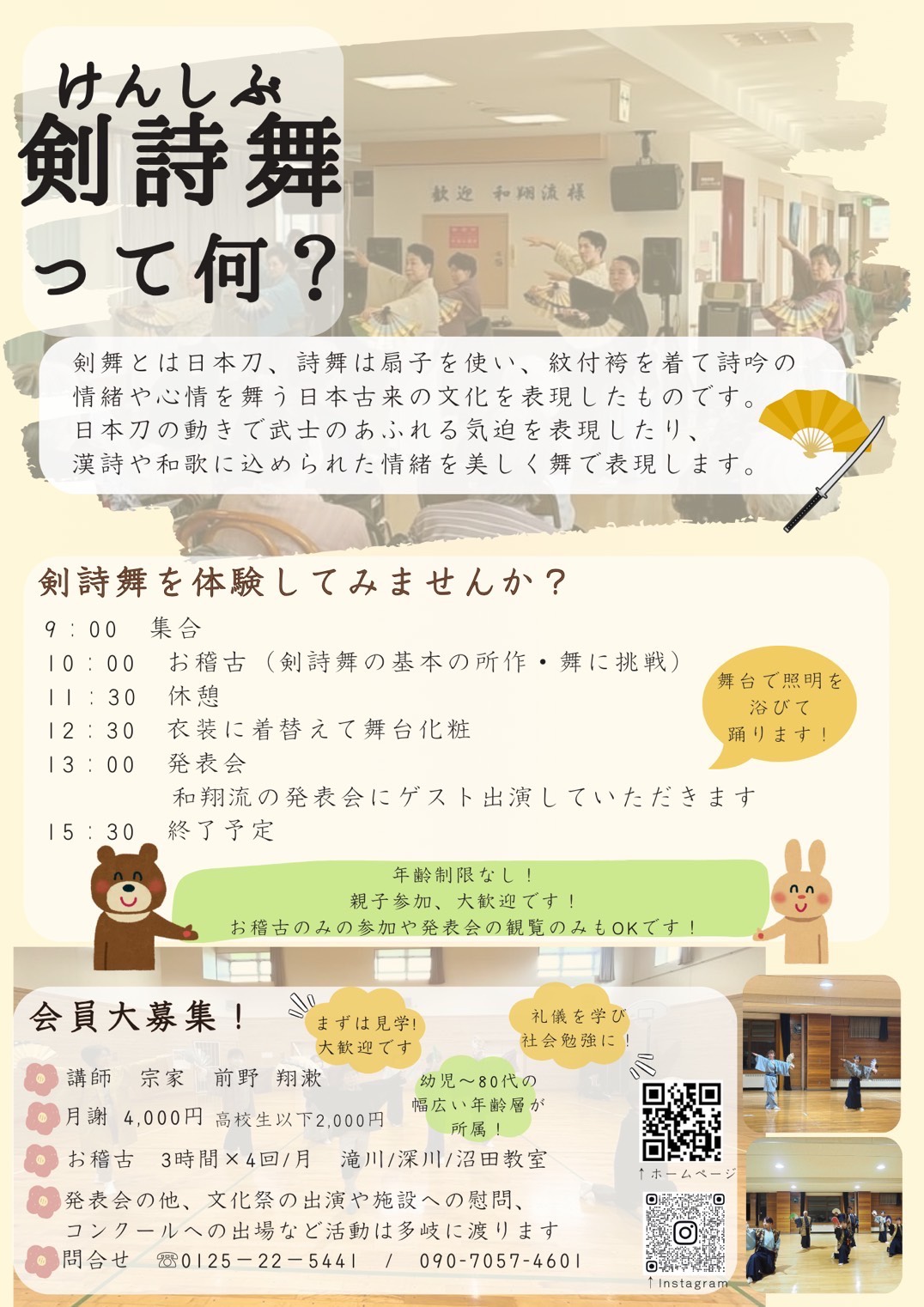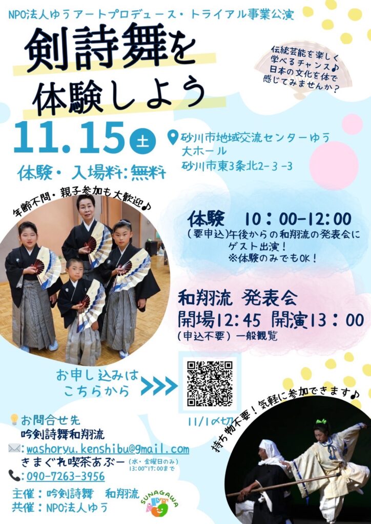 11月152025 ゆうアートプロデュース・トライアル事業「剣詩舞を体験しよう」 空知に3カ所のお教室を持つ「吟剣詩舞 和翔流」の皆さんが、体験会を開催します! 子どもから大人まで、楽しく日本の文化を学ぶことができます♪ 公演名ゆうアートプロデュース・トライアル事業「剣詩舞を体験しよう」 日 時2025年11月15日(土) 〈体 験〉10:00~12:00 〈発表会〉開場12:45 開演13:00 体験会のお申し込みは、下記「体験会お申込み」ボタンから「申し込みフォーム」に必要事項を入力してお申し込みください 会 場砂川市地域交流センターゆう 大ホール (砂川市東3条北2丁目3-3 JR砂川駅直結) 参加費・入場料無料 共 催NPO法人ゆう 主 催吟剣詩舞和翔流 お問合せ吟剣詩舞和翔流 ✉ washoryu.kenshibu@gmail.com きまぐれ喫茶あぶー ☎ 090-7263-3956 (水・金曜日のみ 13:00~17:00まで) 体験会お申込み