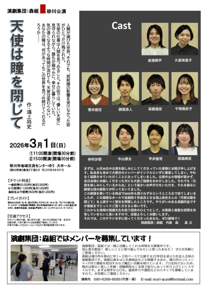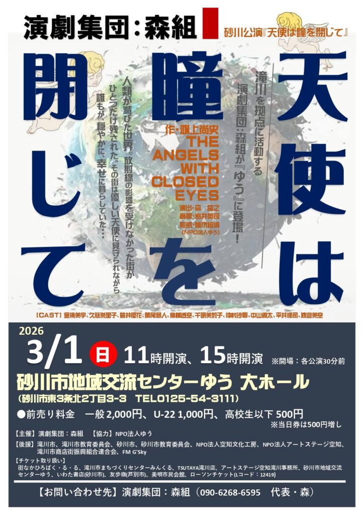 3月012026 演劇集団:森組 砂川公演『天使は瞳を閉じて』 公演名演劇集団:森組 砂川公演『天使は瞳を閉じて』 日 時2026年3月1日(日)開場10:30 開演11:00 開場14:30 開演15:00 会 場砂川市地域交流センターゆう 大ホール (砂川市東3条北2丁目3-3 JR砂川駅直結) チケット(全席自由席)一 般 2,000円(当日2,500円) U - 22 1,000円(当日1,500円) 高校生以下 500円(当日1,000円) チケット取り扱い【砂川市】 砂川市地域交流センターゆう / いわた書店 【滝川市】 街なかひろばく・る・る / 滝川市まちづくりセンターみんくる / TSUTAYA滝川店 アートステージ空知滝川事務所 【その他】 美唄市民会館 / 友歩嶺(芦別市)/ ローソンチケット(Lコード:12419) 後 援滝川市 / 滝川市教育委員会 / 砂川市 / 砂川市教育委員会 / NPO法人空知文化工房 / NPO法人アートステージ空知 / 滝川市商店街振興組合連合会 / FM G’sky 協 力NPO法人ゆう 主 催演劇集団:森組 お問合せ演劇集団:森組 ☎090-6268-6595(代表・森)