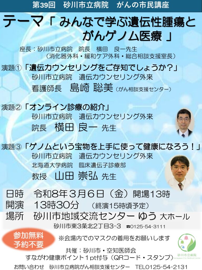 | 公演名 | 第39回 砂川市立病院 がんの市民講座「みんなで学ぶ遺伝性腫瘍とがんゲノム医療」