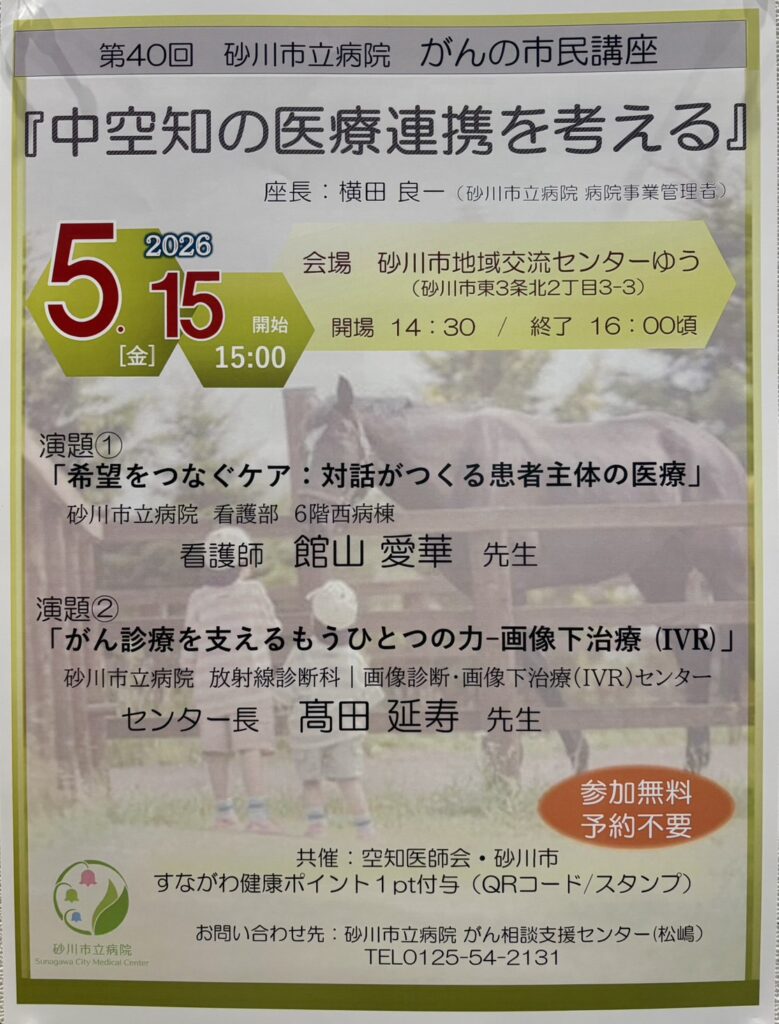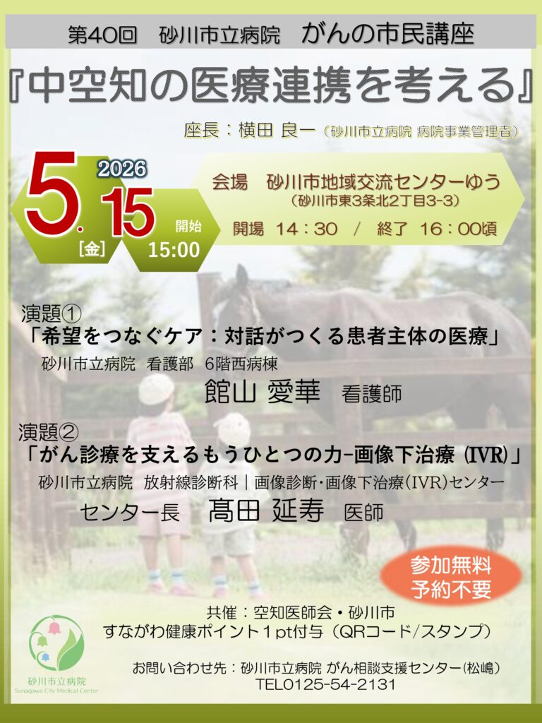 5月152026 第40回 砂川市立病院 がんの市民講座『中空知の医療連携を考える』 公演名第40回 砂川市立病院 がんの市民講座『中空知の医療連携を考える』 日 時2026年5月15日(金) 開場14:30 開演15:00 終演16:00頃予定 会 場砂川市地域交流センターゆう 大ホール (砂川市東3条北2丁目3-3 JR砂川駅直結) 入場料参加無料・予約不要 内 容座長:砂川市立病院 病院事業管理者 横田 良一先生 ・演題①「希望をつなぐケア:対話がつくる患者主体の医療」 砂川市立病院 看護部 6階西病棟 看護師 館山 愛華先生 ・演題②「がん医療を支えるもうひとつの力-画像下治療(IVR)」 砂川市立病院 放射線診断科│画像診断・画像下治療(IVR)センター センター長 髙田 延寿先生 共 催空知医師会 / 砂川市 主 催砂川市立病院 お問合せ砂川市立病院 がん相談支援センター(松嶋) ☎0125-54-2131