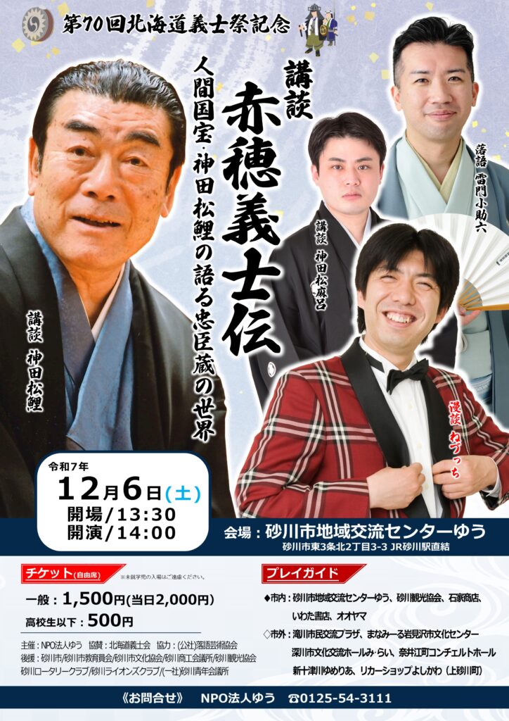 12月062025 【10月11日チケット発売開始!】第70回北海道義士祭記念 講談 赤穂義士伝 人間国宝・神田松鯉の語る忠臣蔵の世界赤穂浪士四十七士の墓がまつられ、毎年12月には「北海道義士祭」が開催される砂川市。北海道義士祭の70回を記念し、忠臣蔵を題材とした演芸講座と公演を開催します。 公演名第70回北海道義士祭記念 講談 赤穂義士伝 日 時2025年12月6日(土) 開場13:30 開演14:00 会 場砂川市地域交流センターゆう 大ホール (砂川市東3条北2丁目3-3 JR砂川駅直結) チケット(全席自由席)一 般 1,500円(当日500円増) 高校生以下 500円 チケット取り扱い【砂川市内】 砂川市地域交流センターゆう / 砂川観光協会 / 石家商店 / いわた商店 / オオヤマ 【砂川市外】 滝川市民交流プラザ / 新十津川町ゆめりあ / 深川市文化交流ホールみ・らい 奈井江町コンチェルトホール / まなみーる岩見沢市文化センター / リカーショップよしかわ(上砂川) 後 援砂川市 / 砂川市教育委員会 / 砂川商工会議所 / 砂川観光協会 / 砂川市文化協会 / 砂川ロータリークラブ / 砂川ライオンズクラブ / (一社)砂川青年会議所 協 力(公社)落語芸術協会 協 賛北海道義士会 主 催NPO法人ゆう お問合せNPO法人ゆう ☎0125-54-3111 ■出演者 前座 桂伸都(落語:前座 北芸亭講師) 神田松鯉(講談師 人間国宝) ねづっち(漫談) 雷門小助六(落語:真打 北芸亭講師) 神田松麻呂(講談師)