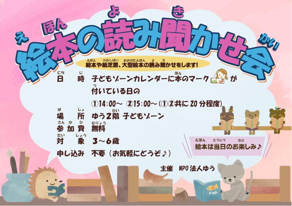 10月072025 〜 3月 312027 絵本の読み聞かせ会 ゆう子どもゾーンで、ボランティアさんによる絵本の読み聞かせ会を開催します! お申し込みは不要ですので、お気軽にお越しください♪ 日 時子どもゾーンカレンダーに、本のマークが付いている日の ①14:00~ ②15:00~ (①②共に20分程度) 場 所砂川市地域交流センターゆう 2階子どもゾーン (砂川市東3条北2丁目3-3 JR砂川駅直結) 参加費無料 対 象3~6歳 申し込み不要 主 催NPO法人ゆう お問合せNPO法人ゆう ☎0125-54-3111