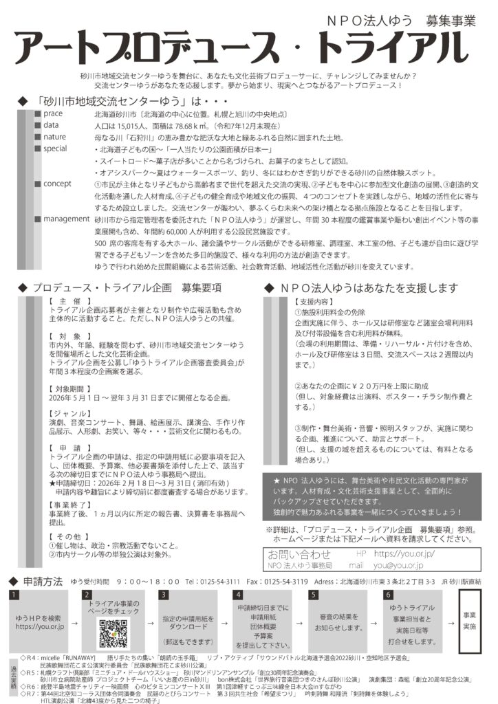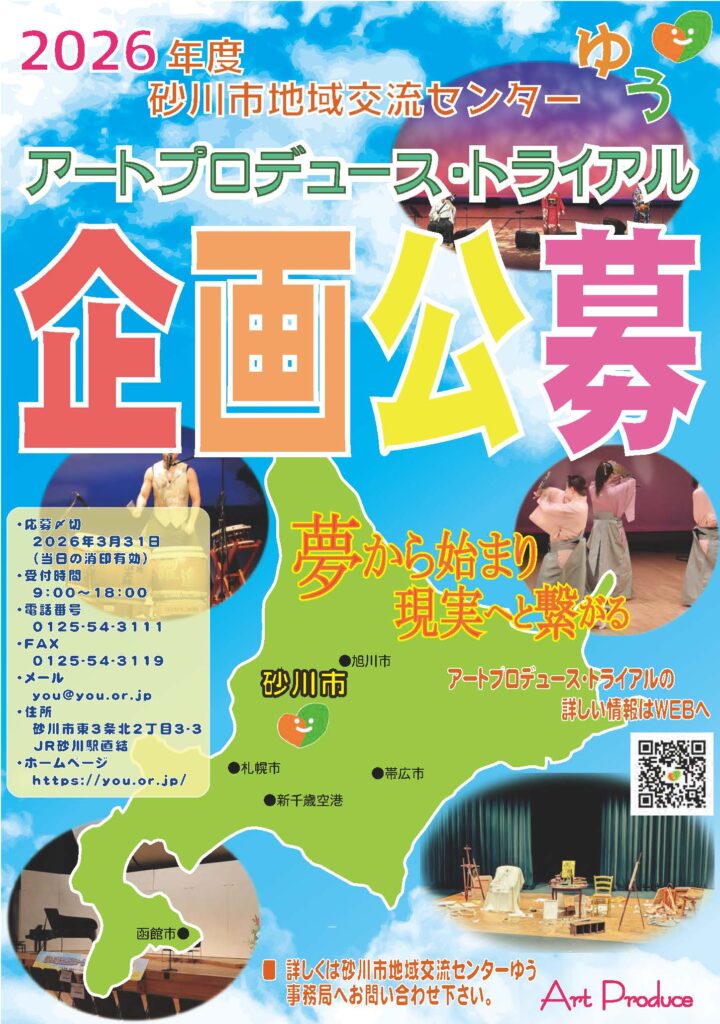 2月182026 〜 3月 312026 2026年度「アートプロデュース・トライアル」企画公募 夢から始まり、現実へとつながるアートプロデュース。砂川市地域交流センターゆうを利用し、あなたが自由な発想で自身でやりたい企画案をお待ちしています。 対 象市内外、年齢、経験を問わず、砂川市地域交流センターゆうを開催場所とした文化芸術企画。 対象期間2026年5月1日(土) ~ 2027年3月31日(月)までに開催となる企画。 ジャンル演劇、音楽コンサート、舞踊、絵画展示、講演会、手作り作品展示、人形劇、お笑い、等々 芸術文化に関わるもの。 申込期間2026年2月18日(水)~2026年3月31日(火)(当日消印有効) お問合せNPO法人ゆう ☎ 0125-54-3111 様式類 ( ▼ からダウンロードください) 001 アートプロデューストライアル実施要綱 002 APT様式1 申請書 003 APT様式2 企画書 004 APT様式3 トライアル企画収支予算書 005 APT裏面 募集要項