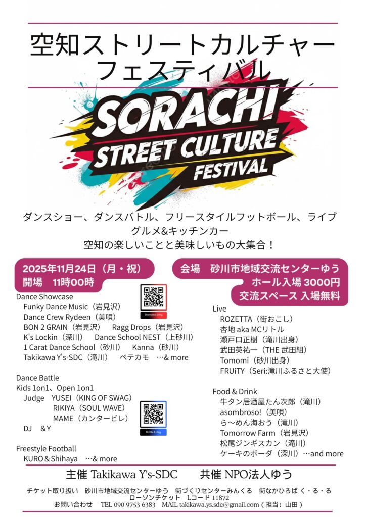 11月242025 SORACHI STREET CULTURE FESTIVAL ダンスショー、ダンスバトル、フリースタイルフットボール、ライブ、グルメ&キッチンカー…空知の楽しいことと美味しいもの大集合! イベント名SORACHI STREET CULTURE FESTIVAL 日 時2025年11月24日(月祝)開場11:00 会 場砂川市地域交流センターゆう 大ホール・交流スペース(ロビー) (砂川市東3条北2丁目3-3 JR砂川駅直結) 入場料3,000円 チケット取り扱い【砂川市内】 砂川市地域交流センターゆう 【砂川市外】 街づくりセンターみんくる / 街なかひろば く・る・る / ローソンチケット(Lコード:11872) 共 催NPO法人ゆう 主 催TAKIKAWA Y’S-SDC 公式Instagram: https://www.instagram.com/takikawa.ys_sdc?utm_source=ig_web_button_share_sheet&igsh=ZDNlZDc0MzIxNw== お問合せ担当:山田 ☎ 090-9753-6383 ✉ takikawa.ys.sdc@gmail.com