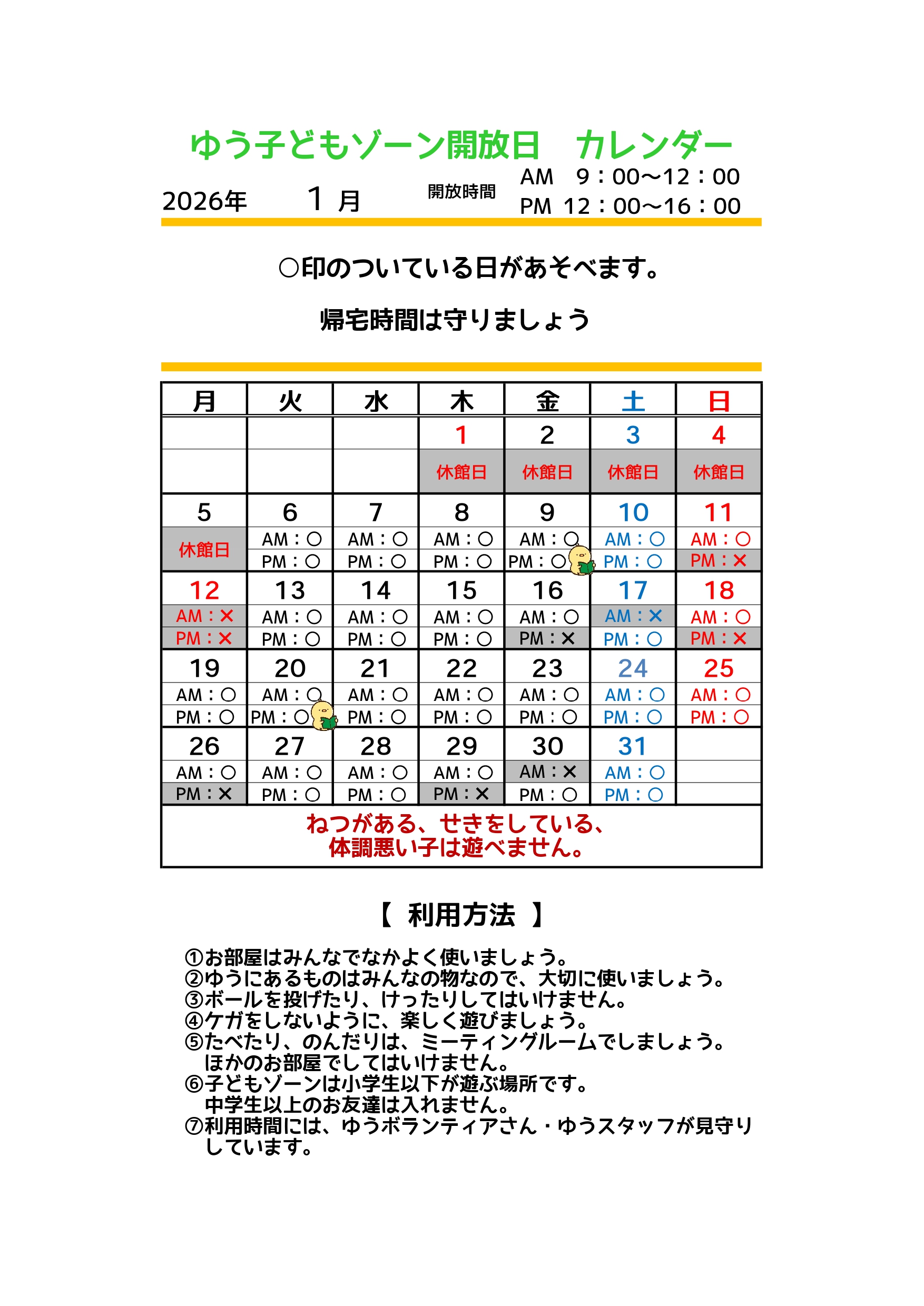 子どもゾーン開放日のお知らせ(2026年1月分)