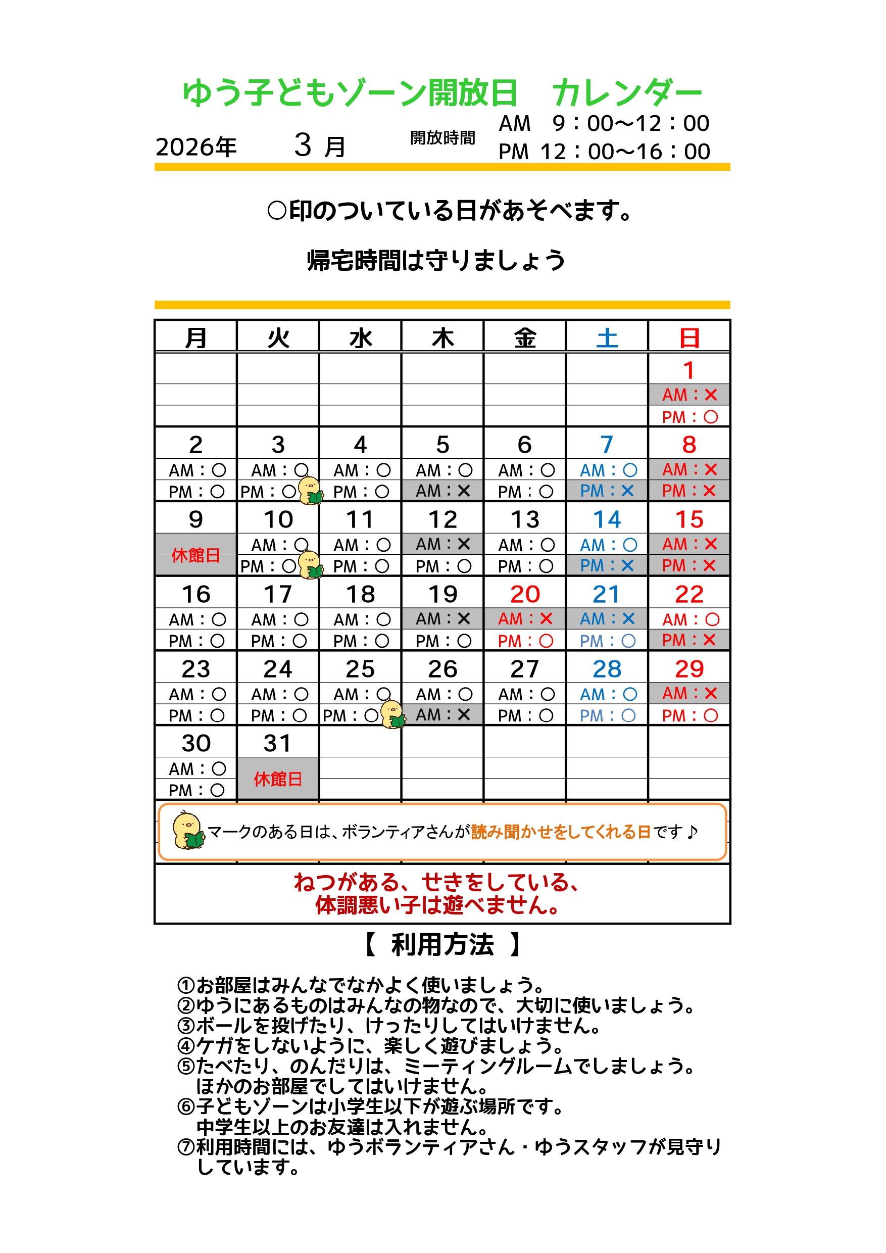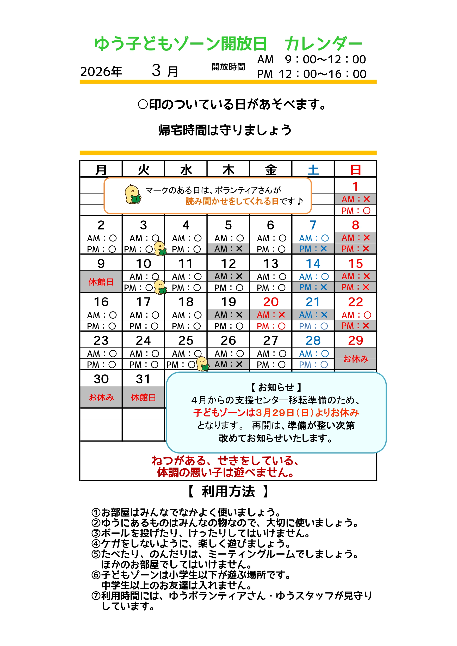 子どもゾーン開放日のお知らせ(2026年3月分)